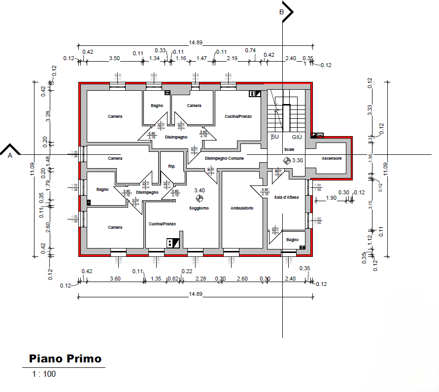 Al primo piano sono presenti due appartamenti ed un negozio di 29 mq, dotato di due vani e un bagno di servizio. Il primo appartamento dispone di un'ampia zona giorno con salotto e cucina openspace, due camere da letto, ripostiglio e bagno con doccia. Il secondo appartamento dispone di cucina, una camera matrimoniale, una cameretta e bagno con vasca.